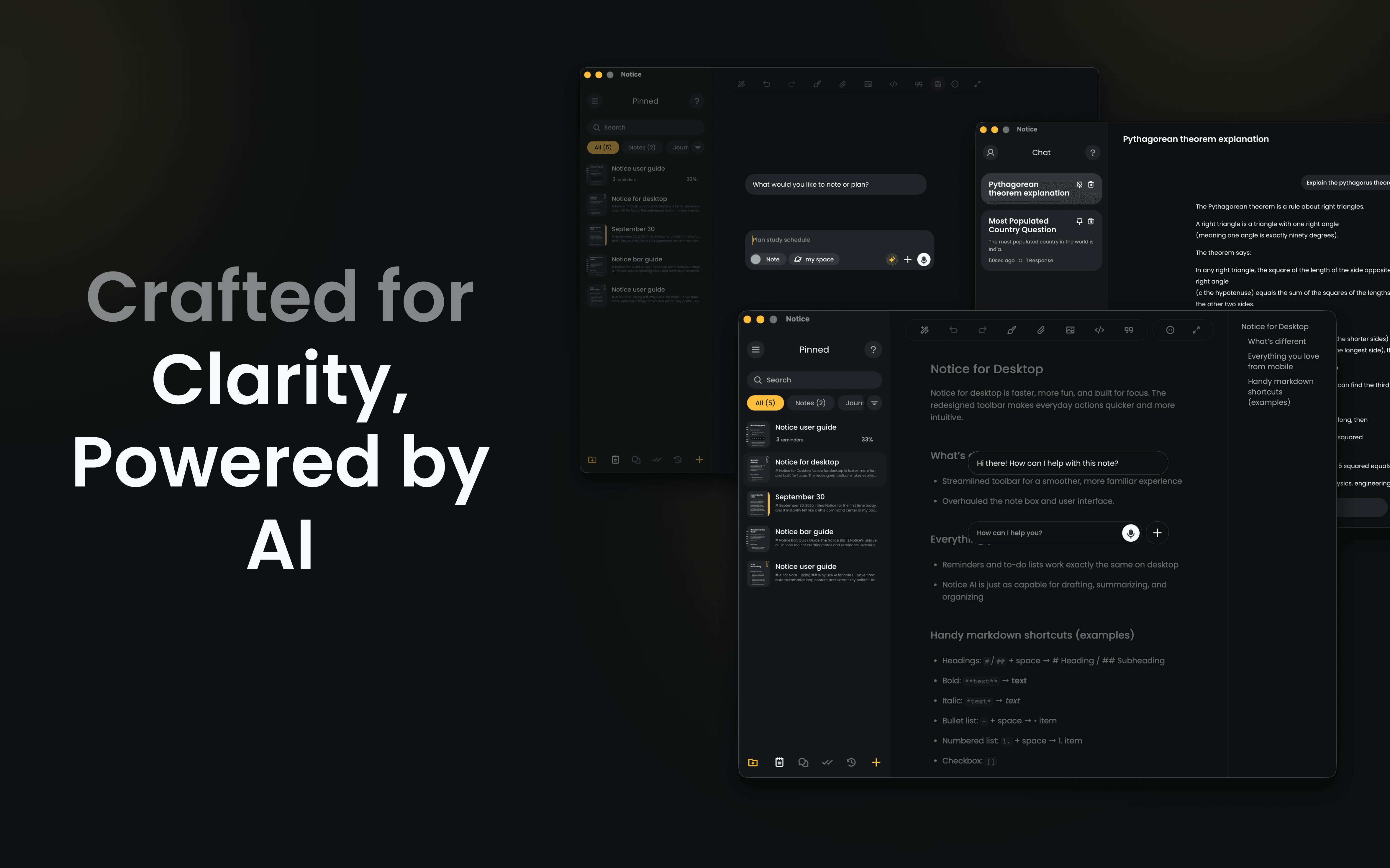 Meet Notice, your all-in-one productivity app designed to help you think clearer, plan smarter, and achieve more effortlessly.